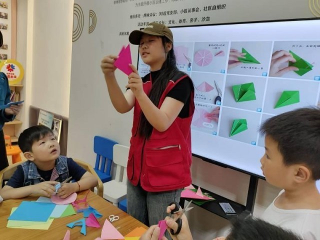随后,志愿者们带着小朋友们一起制作了象征着温馨母爱的康乃馨折纸花。首先,志愿者们带着小朋友先制作了康乃馨的花瓣,紧接着是下面的花杆,最后是花托和用于装饰的花叶。在制作的过程中,小朋友们展现了极高的热情,他们在志愿者的带领下有条不紊地进行着每一步。每一朵倾注着对母亲浓浓爱意的折纸花都显得那么美丽与珍贵。