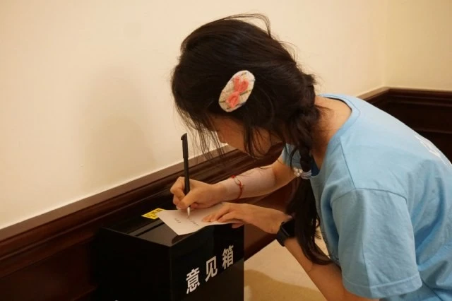 图为实践团成员给工人文化宫发展建言献策参观杭州市工人文化宫如同坐上一趟从过去开往未来的时光列车,实践团成员们仿佛置身于一个个浓墨重彩的历史转折点上,眼前浮现的是当年工人们风华正茂意气风发的模样,心中满怀着对工人们所取得的成就而生的喝彩和敬佩。参观会有结束时间,而这趟列车将会坚定不移地驶向未来。