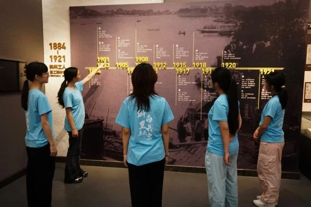 图为实践团成员学习工人运动时间线劳动创造世界。工人们以微薄双手,搭建起大千世界,犹如微弱星辰,汇聚璀璨星河。时代瞬息万变,新业态用工者们如同初升的群星散落在浩瀚宇宙,散发着源源不断的活力。护航‘新’业态,凝聚‘星’活力”实践团将沿着他们的足迹,去感受新时代劳动者的别样风采。