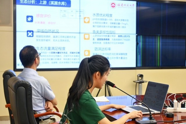 随后,实践队代表董艺蕾同学对福建师范大学环境与资源学院暑期实践队在溪源江的调研结果进行了汇报,董艺蕾同学首先对溪源江上、中、下游的生态进行了分析,分析结果显示溪源江生态满意程度为良好。接着,她分别从安全、健康、生态、美丽、和谐五个维度进行了详细的问卷调查。最后,她代表实践队提出了有关幸福河湖建设提升的建议,具体建议为加强各高校污水处理系统、针对非法捕鱼现象出台相关政策、进一步完善河岸线的垃圾清理管理制度以及加强幸福河湖建设的宣传力度。报告深入浅出,既有详实的数据支撑,也有生动的案例分析,赢得了在场人员的广泛赞誉。