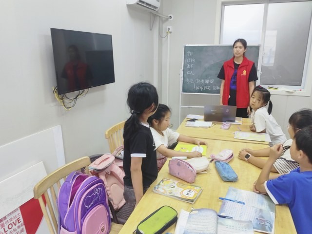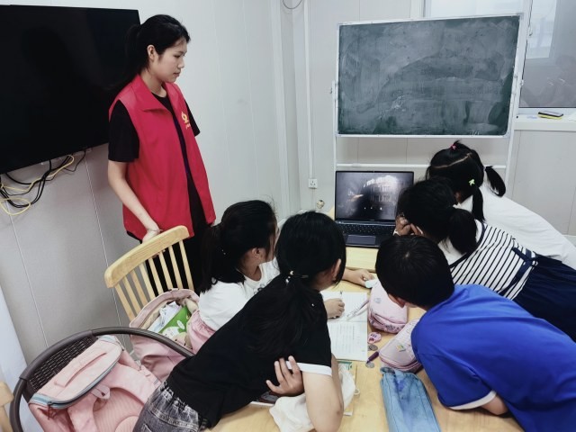 图为志愿者带领儿童们观看防灾视频 大学生网报通讯员赵越供图