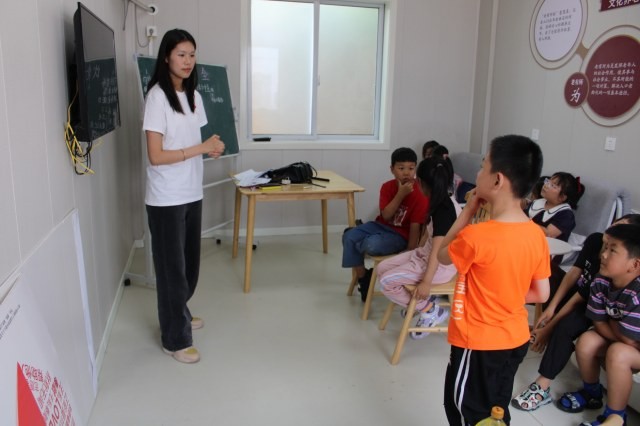 图为志愿者为儿童们讲解灾害形成原理,增强理论知识 大学生网报通讯员赵越供图