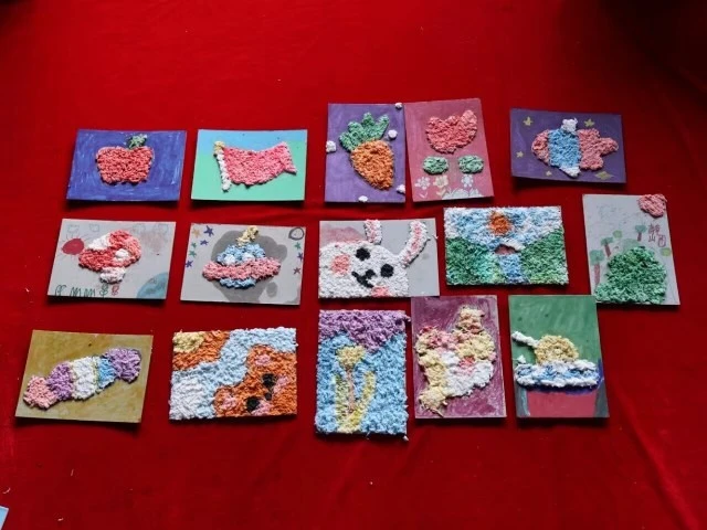 纸浆画是通过特殊工艺制作成纸浆,然后进行勾线画稿,调制颜料,再让创作者自由配色的一种非遗手工技艺。邓玉香队员把纸浆画教学分为三个部分展开:理论教学——讲解非遗雅韵、实践操作——细致教学引导、作品展示——拍照合影留念。在课程中培养学生的动手操作能力、想象力,提高审美能力和耐心。