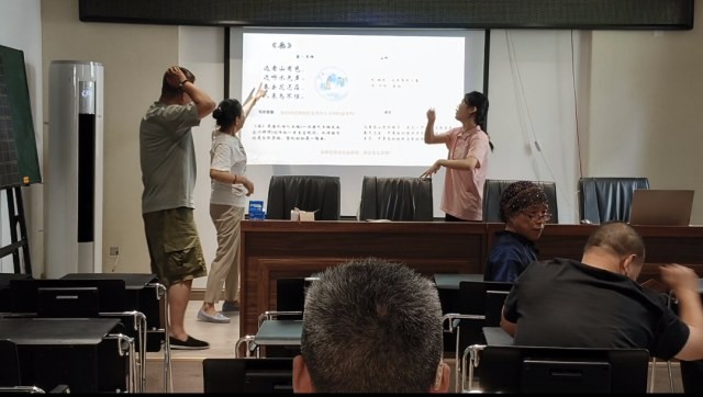 “手语传经典”暑期实践团队于七月九日下午两点在郑州市中牟区成功开展第二次黄河文化和中华经典诗词的宣讲与学习。本次活动旨在通过讲解黄河文化和中华优秀传统诗词,向聋人群体推广国家通用手语,共同传承和弘扬中华文化的精髓,活动反响热烈,受到了听障人群的一致好评。