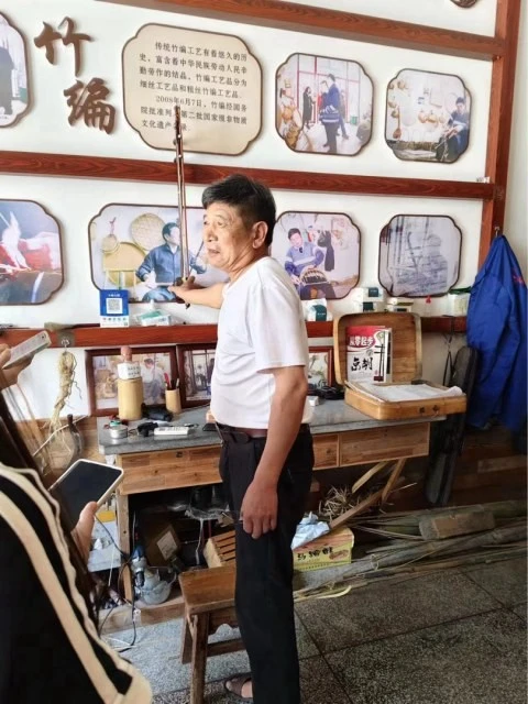 图为竹编手艺人向队员介绍自己做的二胡。大学生网报通讯员 何菲 摄