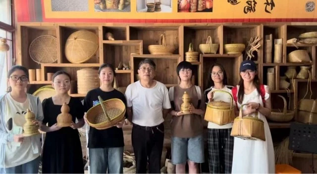 图为队员们与竹编手艺人及其作品的合照。大学生网报通讯员 许雨梦 摄