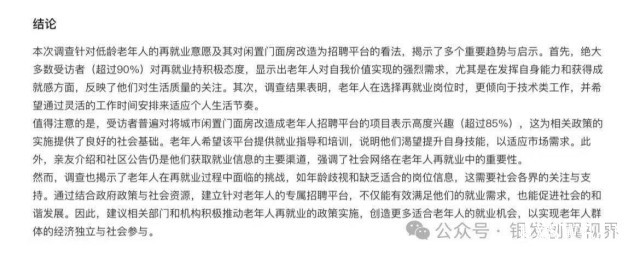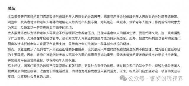随着社会老龄化进程加速,低龄老年人(60-75岁)再就业已成为不可忽视的社会议题。基于203份问卷的深入调研,本报告聚焦该群体再就业意愿与需求,并创新性提出通过改造城市闲置门面房构建专属招聘平台的解决方案。数据显示,超过90%的受访老年人对再就业持积极态度,其核心动力源于对自我价值实现的追求——68%的受访者希望“发挥专业能力”,59%渴望“获得社会认同”。一位曾从事机械设计的老工程师坦言:“我的经验还能为年轻人传道授业十年!”