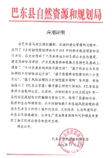 该专著被巴东县、恩施市、鹤峰县、建始县、来凤县、利川市、天津市、宣恩县等8个市县纳入村庄规划编制、实施和建设管理参考,指导多个行政村开展试点实践。