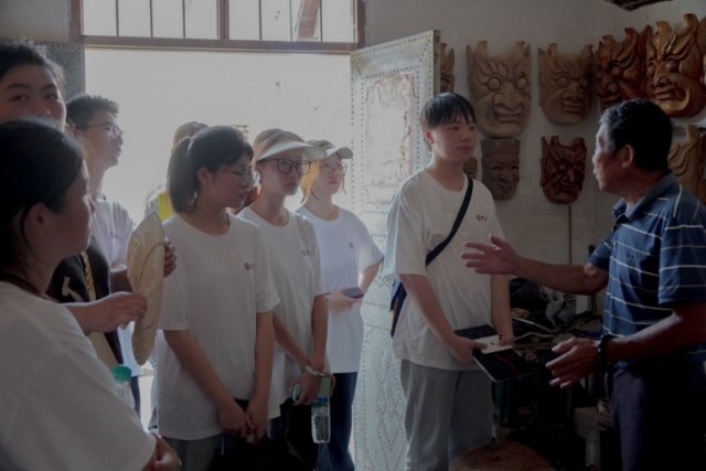 图为志愿队成员在听傩面具制作人讲解傩面具的故事。大学生网报通讯员 谢庆摄 (通讯员 陈昊)