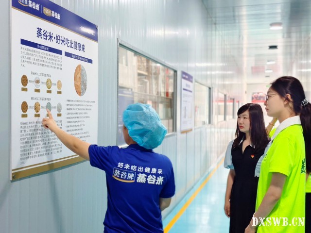 在质检部工作人员李敏的带领下,团队参观了蒸谷米公司的生产车间,深入了解企业历史、文化和独特工艺。2019年,蒸谷米示范工厂在小岗产业园落成投产,蒸谷米是产业园最早招来的企业之一。企业目前形成了以蒸谷米为核心的水稻育种、产品研发、装备制造、原粮种植、生产加工、品牌营销六大产业板块,堪称亚洲顶尖、世界一流。