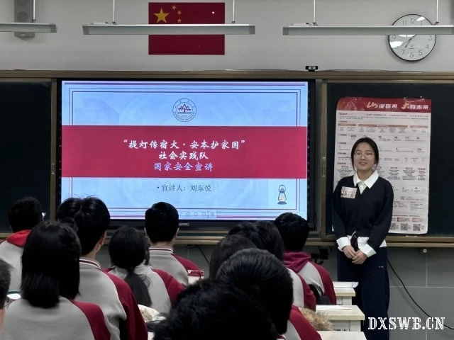 队员刘东悦首先以一个形象的比喻开启了此次宣讲之旅:“国家安全如大厦,各部分紧密相连,缺一不可。”随后,她深入各个安全领域展开讲解。在政治安全板块,她引入国际政治动荡案例,引导同学们洞悉其对国家稳定的关键意义,同学们专注聆听,目光中满是思索。谈及经济安全,她从网络购物、金融诈骗等日常现象切入,让同学们切实体会到经济安全与生活的紧密关联。介绍资源安全时,刘东悦以校园食堂剩饭、教室空灯长明等现象为例,启发同学们反思个人行为对资源安全的影响。讲述国土安全时,她先展示祖国壮美山河图片,继而回溯历史伤痛,唤醒同学们守护国土的责任感。宣讲中,刘东悦还分享了参观国家安全宣传基地的见闻,展示间谍窃取机密工具手段,令同学们惊叹不已,深刻认识到国家安全形势的复杂性。