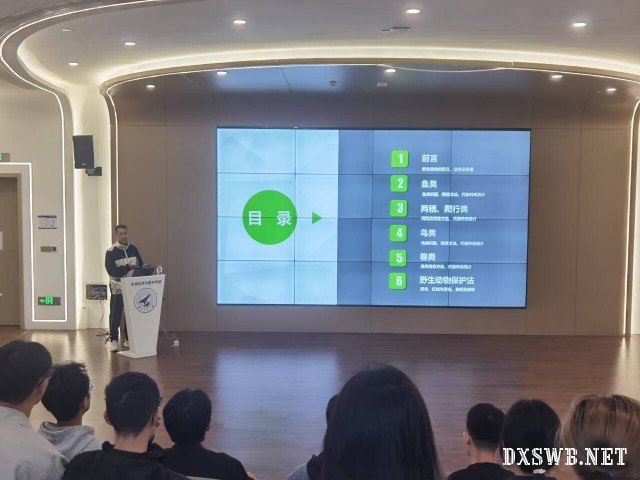 讲座中,孔飞系统介绍了鱼类、两栖类、爬行类、鸟类和兽类等野生动物的识别方法与调查技巧,并通过生动的案例和详实的数据,为同学们建立起野生动物的认知模型,进一步激发了大家参与野生动物保护的兴趣。随后,他以《中华人民共和国野生动物保护法》为例,强调了法律在野生动物保护中的关键作用,并结合实际案例,引导同学们认识到遵守相关法律法规的重要性。