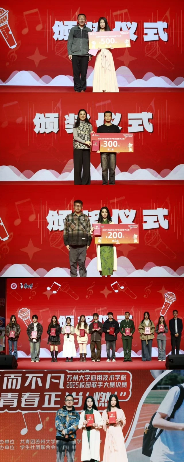 经过三轮激烈角逐,最终,文旅学院农嘉慧同学凭借一曲《阿刁》,赢得了评委们的一致称赞,获得2025年苏州大学应用技术学院校园歌手大赛的冠军,工学院盛超同学获得亚军,文旅学院王茹同学获得季军。