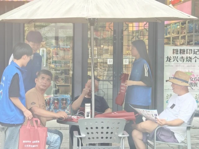 图为路边凉亭内队员向群众开展反邪教宣讲并分发宣传物品。大学生网报通讯员 朱灵杰 供图
