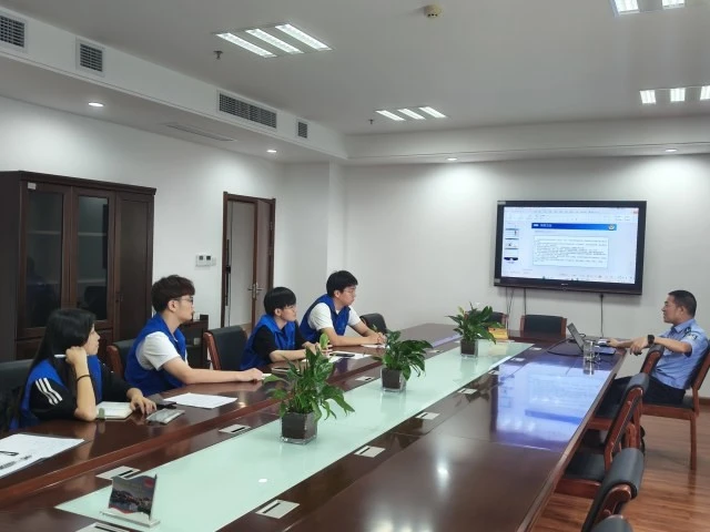 图为队员和临海反邪教协会周理事长讨论活动开展的细节。大学生网报通讯员 朱灵杰 供图