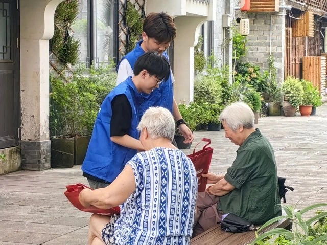 图为实践队队员向老年人分发反邪教宣传物品。大学生网报通讯员 朱灵杰 供图