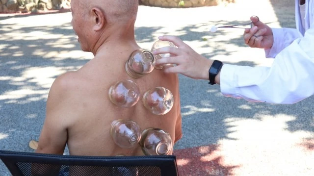 图为实践队员为村民进行拔罐疗法。大学生网报通讯员 廖胡洋供图。