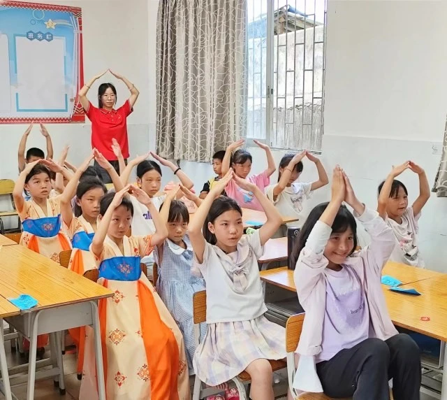 图为表演课上支教组队员和小朋友们一起表演《感恩的心》手势舞(大学生网报通讯员 黄烁娃供图)