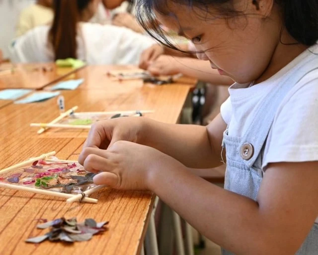 图为艺术课程上小朋友正在专心致志地制作花瓣相框(大学生网报通讯员 刘嘉佳供图)