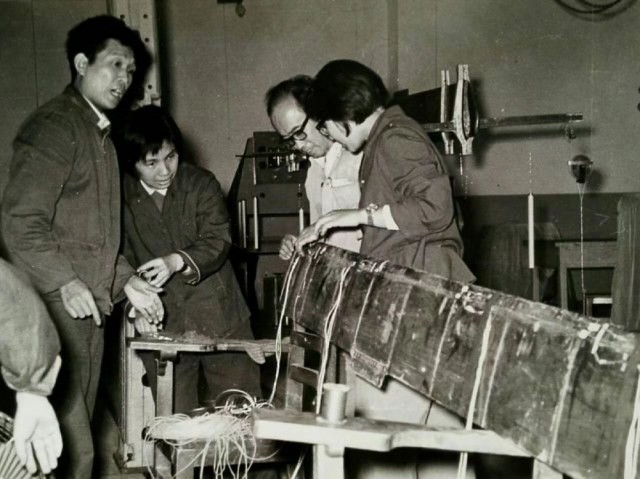 图为沈梦山教授(左二)和梅卫胜教授(右一)延安二号复合材料旋翼叶片静力试验,贴应变片。大学生网报通讯员 刘星宇 供图