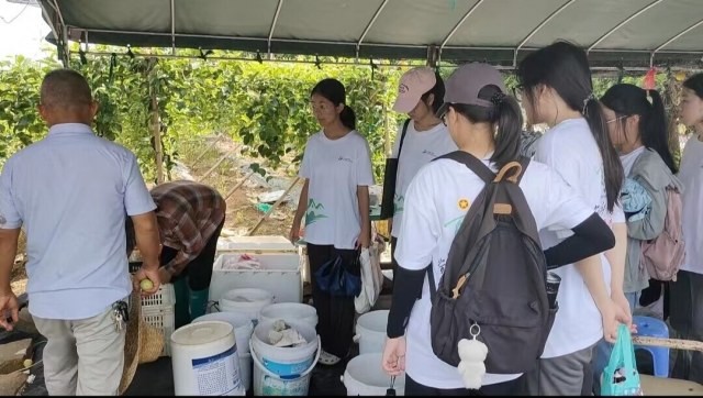 (图为工作人员为突击队成员展示百香果采摘情况。大学生网报通讯员 李晓蓉 供图)