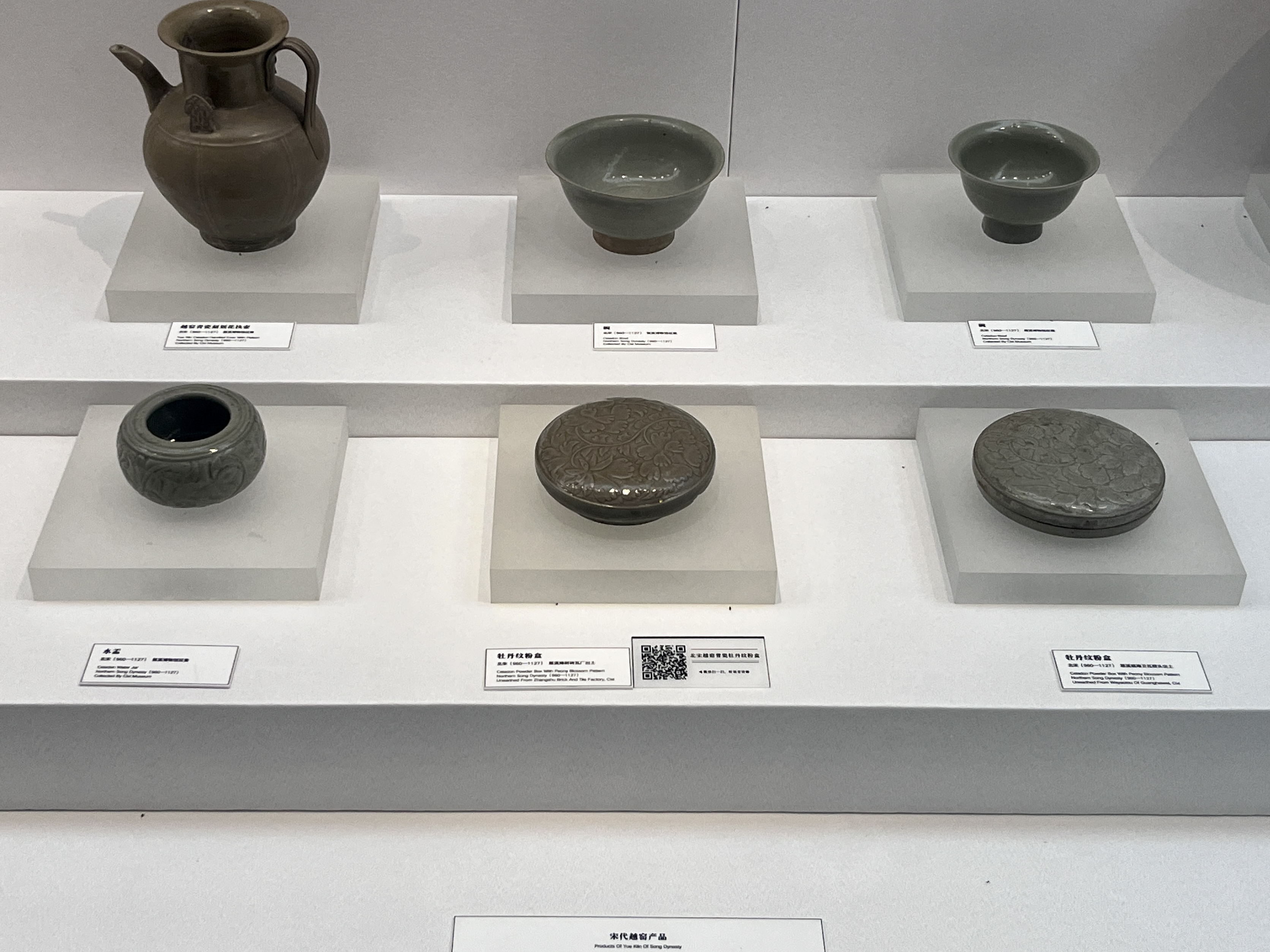 进入博物馆,映入眼帘的是一部在不间断播放的宣传片,在宣传片中,青瓷显得那么高贵与神秘,怀着一种朝圣的心情,小队成员走进了装载了青瓷秘密的展厅。在这里,成员们沿着历史的长河回溯了上林湖越窑青瓷从东汉中期开始创烧,东晋、南朝一直持续着小规模生产,到唐中晚期时,上林湖越窑迎来了它的繁荣时期,并且这个盛世一直持续到了北宋中晚期的全过程。作为展品的瓷器静静地陈列在展柜里,等待着人们去发掘他们身上的故事。从展柜前走过,凝望着里面素净的瓷器,好像回到了那个将军横刀护山河,万千子民精忠二字刻心间,达官贵族乘一叶扁舟寻仙境,文人墨客于林间如痴如醉的时代,那个红尘滚滚、灯火通明、充满欢声笑语与烟火气的汴京城。