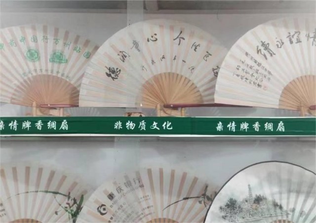 在这小小的店铺中有一个很大的双层玻璃柜,里面盛放了不少香绸扇成品,让采访人员比较在意的是不少扇子上都印下了广告,“现在香绸扇的热度不以往,只得靠政府的扶持继续下去,接广告也是自然的事。”黄胜科的妻子向采访人员解释,采访人员追问这项非遗的未来前景如何,前者回应道:“再做个几年,国家会对这项技术有安排的。”