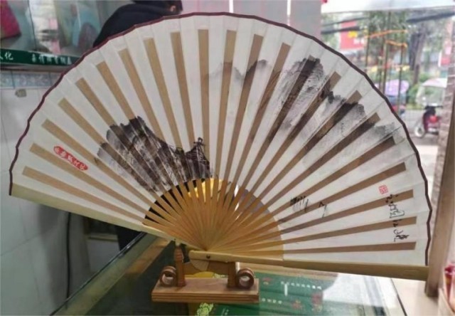 这是一柄绘有山水美景的香绸扇。“我们会将开州本地的景点,诸如雪宝山、汉丰湖还有刘帅纪念馆画在扇上,用来吸引客人的兴趣”,黄圣科老师对采访人员解释道。