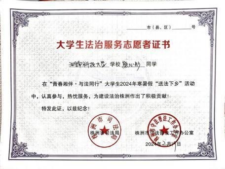 2024年寒假大学生送法下乡活动,是我“返家乡”社会实践的“第二站”,也是我参与活动时间最长的一站。从2024年1月30日至2月24日,活动在各市镇街道、社区村落、店面校园等地方连续进行了26天。在湖南省株洲市司法局的组织下,由醴陵市司法局的带领,面对湖南多变的天气,我们大学生志愿者们无谓严寒,无谓遥远的距离,积极参与了每一次普法活动,从街头到小巷,从村落到校园,有关法律的知识就在我们手中一次次传递,我们用着最生动的案例为他们答疑解惑,捧出一颗最真挚的心将寒冬的冰雪捂热。市民们从“听不懂法”到“学会用法”,村民们从“不接受法”到“感谢有法”。口口相传,声声信仰,有关“法”的火炬,在我们手中接力点亮。“还是现在我们党好,现在我们社会主义搞得好,都为百姓着想,什么立法都要看为不为百姓”,“对啊,我儿子去年被公司突然辞退,差点拿不到工资,幸好有法律援助机构帮忙,才知道法律也保护我们劳动者嘞。”市民们拿着普法宣传单上的案例这样讨论着。听到这些,我看到的却是国家更加遥远的未来,那是一条朝着法治建设道路稳步前行的光明道路,身为大学生,我对国家未来的建设充满信心,更怀揣着无限激情,在这样的想法当中,我继续走向下一个宣传地。