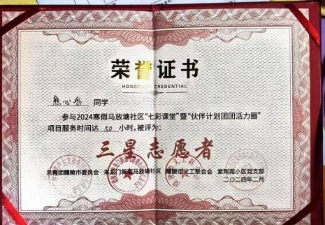 图为志愿者熊心彤获得的组织单位与当地团市委的奖励认定