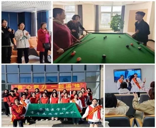 4月14日,志愿者们前往承德市寿康康养中心给老人们带来陪伴和关爱。志愿者陪老人与老人们一同唱歌、打台球,还为他们讲解了一些疾病预防知识。此活动不但让老年人感受到了社会的关爱,而且提高了志愿者们的社会实践能力,弘扬了尊老敬老的传统美德。