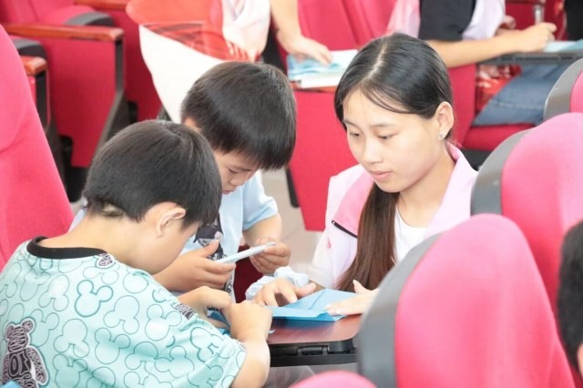 图为队员帮助孩子们折纸飞机。大学生网报通讯员 邱晨 供图