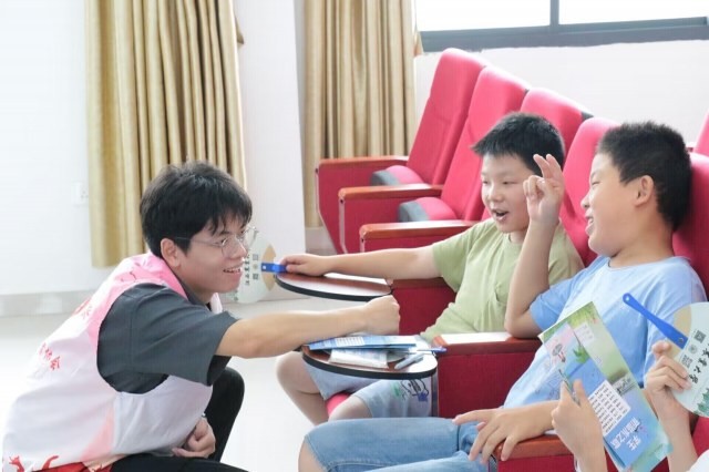 图为休息时间队员与孩子们的温情聊天。大学生网报通讯员 邱晨 供图