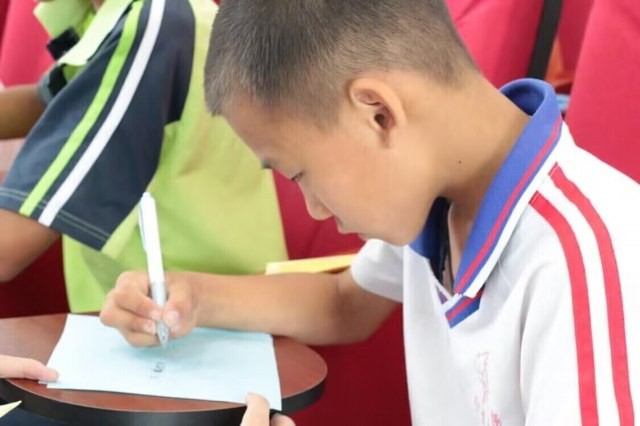 图为孩子正在卡纸上写心愿与寄语。大学生网报通讯员 邱晨 供图
