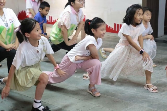图为孩子们跟练热身操的压腿运动。大学生网报通讯员 邱晨 供图
