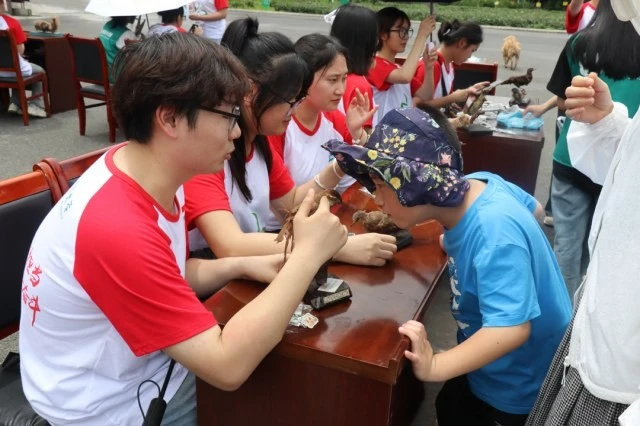 图为志愿者生动形象地向讲解展示的鸟类标本。大学生网报通讯员 符金金 供图