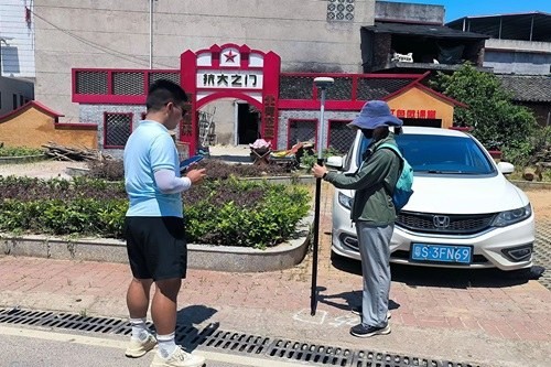 第二天,根据前一天的实地考察和走访调研,在汪奇生老师的指导下,帮扶团成员劳烨,郑伟,周鹏从村委前坪出发,在污水处理站附近设计控制点,使用RTK对村中已有管道和待铺设管道的走向进行测量,一路经过夫夷河畔,污水处理站,村民住房,测回村委前坪,形成闭环,做到了全方位覆盖,同时得到了污水处理站及其周边的定点数据,为排污管道的精确设计提高了保障。