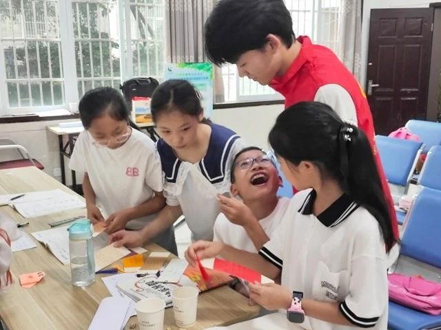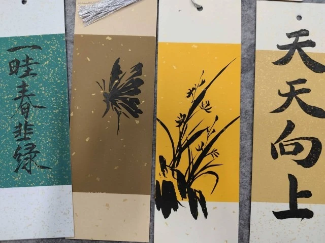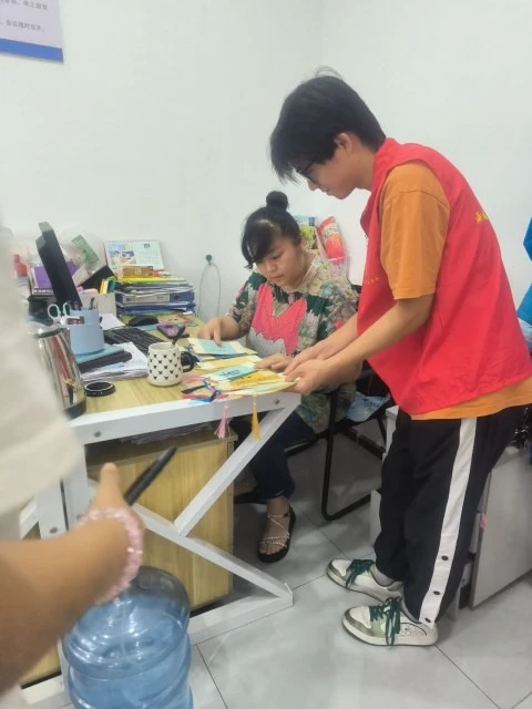 7月8日,小队成员来到中大街社区,给社区中暑假托管的孩子们讲解书法与国画,分发孩子们喜欢的书签。尽管接近下课时分,但孩子们仍对书签上行云流水的字和活泼灵动的画有着浓厚的兴趣和向往。这也许仅是一个普通的国画宣扬活动,但也给孩子们幼小的心灵种下了一颗喜爱传统书画的种子。