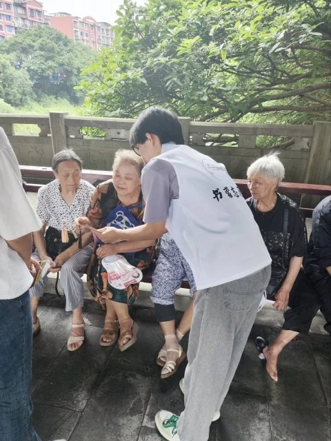 7月5日,小队成员前往新康路社区宣讲,首先去到人来人往的廊桥,古朴的建筑散发着浓厚的文化气息,排排老人齐坐桥头,聊着家常事。接着,成员们沿着廊桥与围坐在一起的居民们交流书画创作与鉴赏,并送出精心准备的书签,这股学习书画的风气也为廊桥增添了一抹亮色。