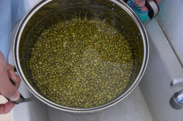 图为小推车成员正在浸泡绿豆。 通讯员 张蕙兰 摄