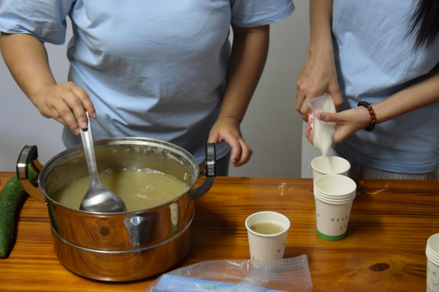 近日,浙工大之江旅游学院“小推车”团队在前一天下午前往镇上去采购绿豆,在第二天一早起来熬制了绿豆汤,并分享给了村委的工作人员以及青坛村的村民,给他们带去了“夏日清凉”。
