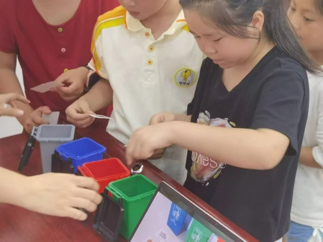 为了让学生们更好地掌握垃圾分类的方法,老师准备了丰富多样的教学道具,包括不同类型的垃圾模型和分类垃圾桶。通过实际操作和互动游戏,学生们积极参与,将垃圾准确地投放到相应的垃圾桶中。