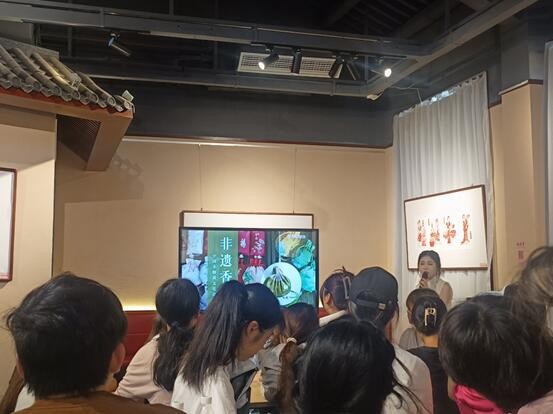 图为老师为“非遗+”团队讲解戴芸伊女士的经历。刘江宇
