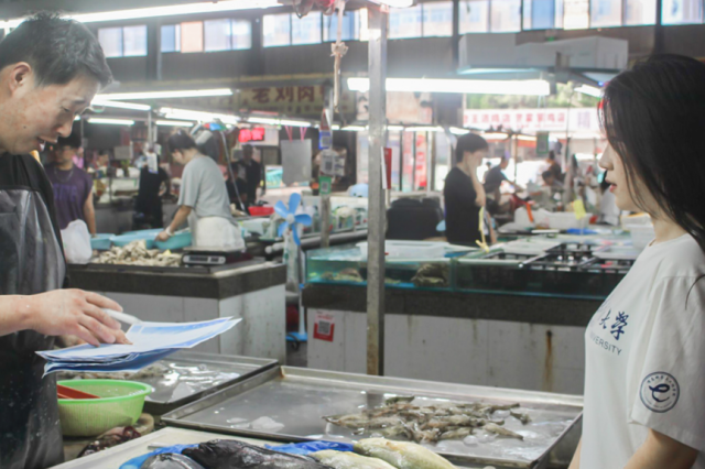 7月24日,队伍前往鲁豫海鲜市场进行调研。队员们走访了各个水产品商铺,与商家进行深入交流,了解水产品的销售情况、质量控制措施及消费者反馈。在调研过程中,队员们收集了大量一线数据,为后续研究提供了宝贵的参考。