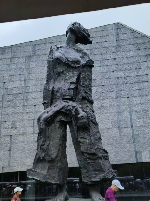 在纪念馆内,队员们首先被一尊高达12.13米的雕塑——《家破人亡》所震撼。这座雕塑以失去孩子的母亲怀抱孩子仰天长啸的形象,生动地展现了南京大屠杀期间无数家庭支离破碎的惨状。