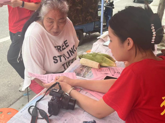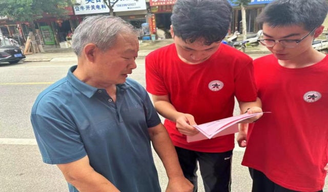 图为队员们向路过的居民发放海报 通讯员杨蕊嘉摄