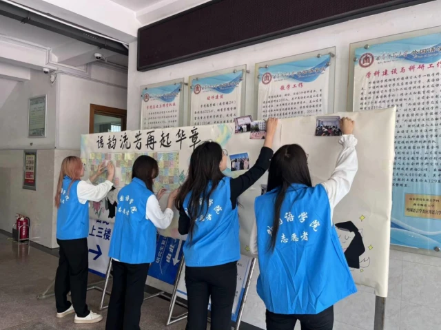 图为队员们在宣传栏张贴照片。 大学生网报通讯员 赵乐冉 供图