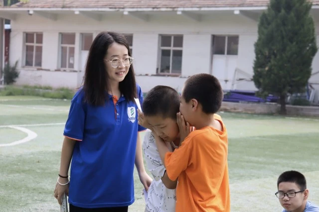 (图为志愿者和孩子们一起进行“传声筒”游戏)