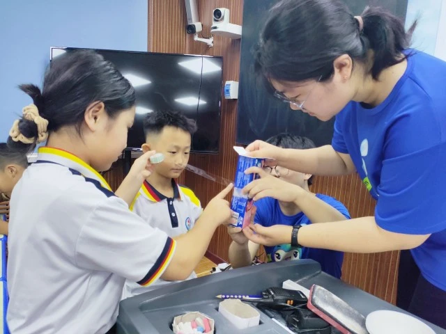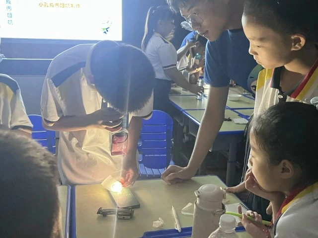 在实验时间里,小朋友们先观看了欧阳老师提前录制的小孔成像相机制作的视频,大致了解了基本步骤,再由欧阳老师在讲台上逐步演示,在其他助教老师的协助下,小朋友顺利地完成了小孔成像相机的制作,成功观察到了自己在硫酸纸上绘制的放大的、倒立的实像。
