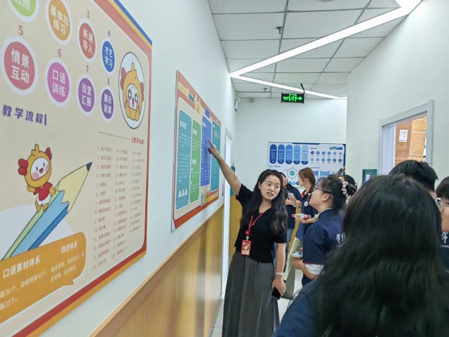 图为优学东方工作人员给实践队成员讲解机构教学特色。通讯员 刘茜瑞 供图